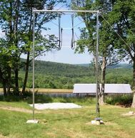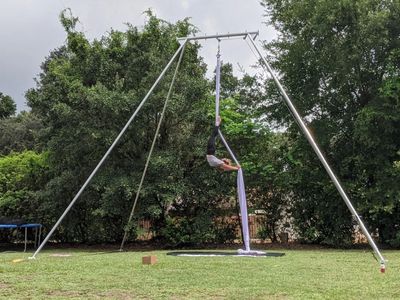 Show Rigs are 20' tall with a 12' crane bar and made with heavy duty aluminum just like we use with the flying trapeze rigs. They come complete with anchors, cable ratchets, guy wires, hardware and three eye bolts. The rigs can support a variety of aerial circus equipment.